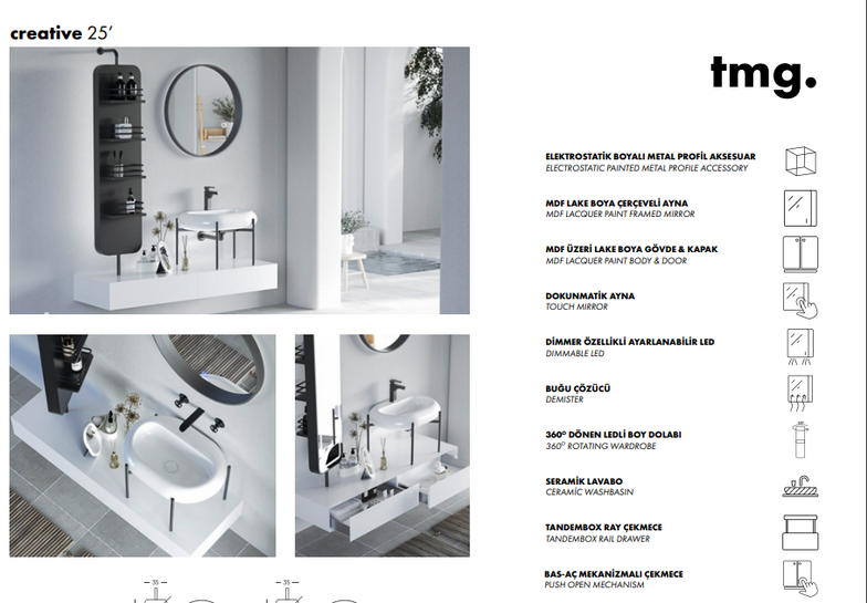 Belinza Creative serisinin Timeless modelinde, elektrostatik boyalı metal profil aksesuar, Mdf lake boyalı gövde & kapak, metal çerçeveli ayna, seramik lavabo, royal mermer tezgah ve frenli kapak özellikleri bulunmaktadır.